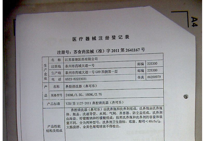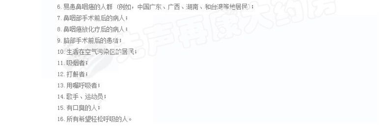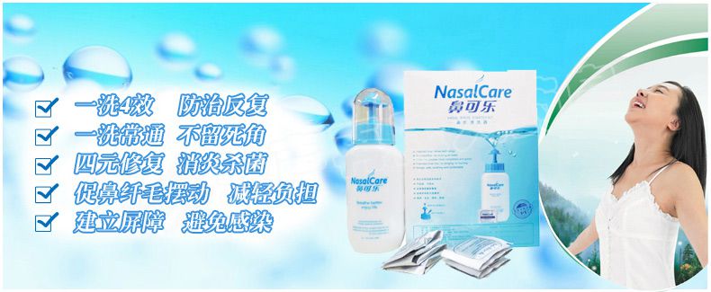 请仔细阅读说明书或在医务人员的指导下购买和使用。 【产品名称】 鼻可乐鼻腔清洗器 【规 格】 240ml+3.5g*10袋 (器+洗鼻剂10袋)【产品特点】 1.双正压反回流专利技术 2.不回流,不呛水 3.全面清洗鼻腔鼻窦 4.发明专利配方洗鼻剂 5.简单、安全、轻松、舒适 【适用范围】 1.用于鼻腔、鼻腔分泌物结痂清洗 2.萎缩性鼻炎药物清洗 3.鼻咽(癌)术后和化疗冲洗 4.清洗鼻部粘膜,避免因粘液在鼻腔的阻塞而导致感染,保护鼻腔粘膜 5.职业性吸入粉尘的鼻腔保健冲洗 【组 成】 1个洗鼻器 、10袋洗鼻剂 【使用方法】 1.加洁净的温水 2.加入洗鼻剂,水平移动摇匀 3.洗鼻 【批准文号】苏食药监械(准)字2011第2641167号 【生产厂家】 江苏泰德医药有限公司 |